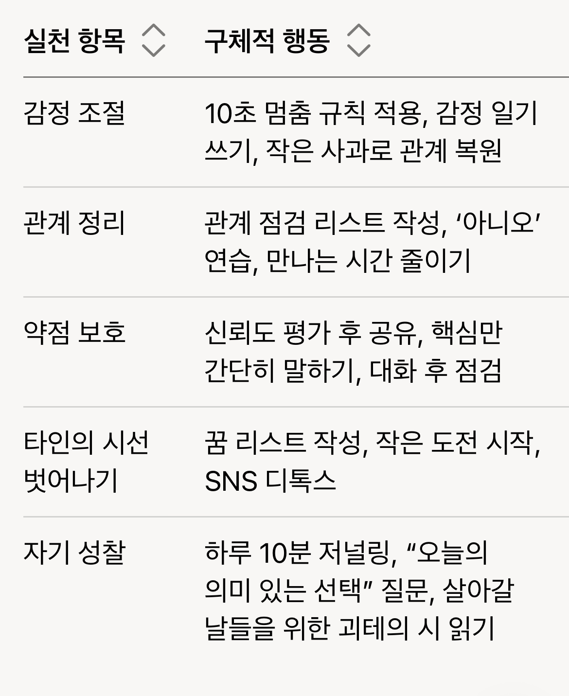후회 없는 삶을 위해 지금 작은 변화를 시작해 보세요. 살아갈 날들을 위한 괴테의 시를 읽으며 삶의 지혜를 얻고, 위 표를 참고해 실천 계획을 세워보세요. 아래 버튼을 눌러 책을 바로 만나보세요!