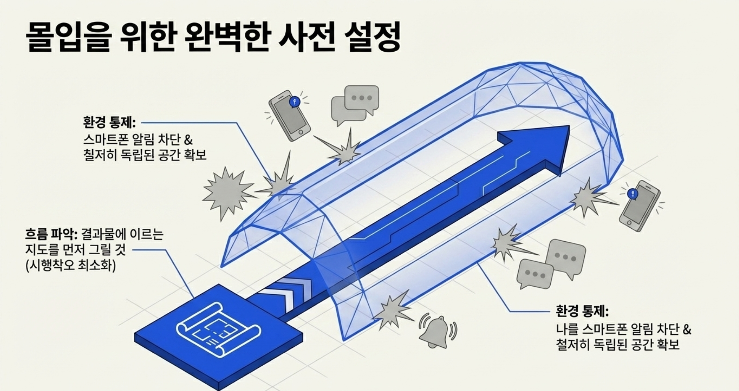 스마트폰 알림을 끄고 완벽히 몰입할 수 있는 독립된 공간을 확보하는 등 방해 요소를 사전에 차단하는 환경 설정은 업무 효율을 수배로 증폭시킵니다.