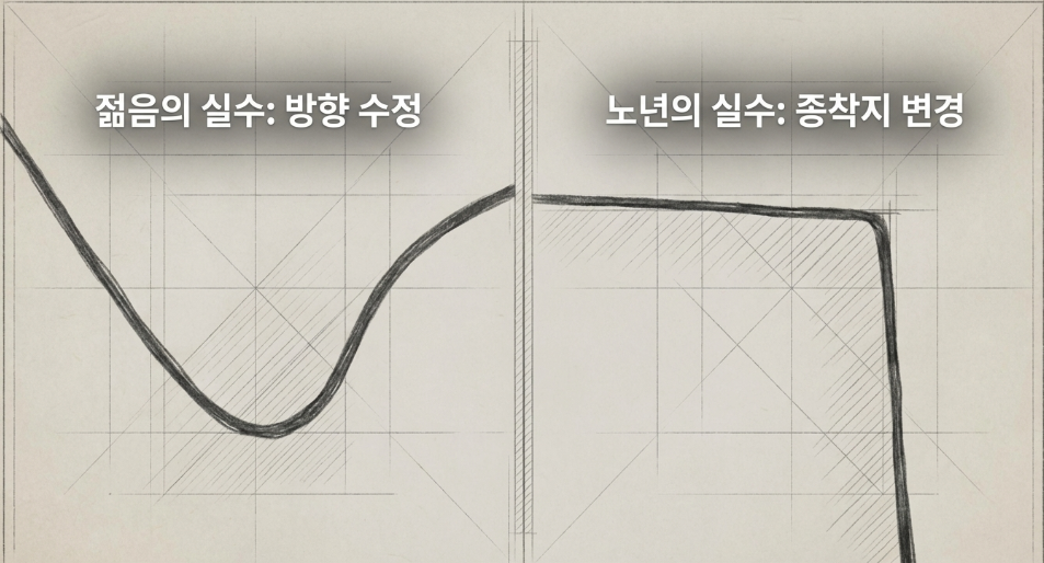 즉, 젊을 때의 잘못된 결정은 방향을 수정할 기회가 되지만, 늙어서의 잘못된 선택은 인생 종착지의 좌표를 바꿔버립니다.