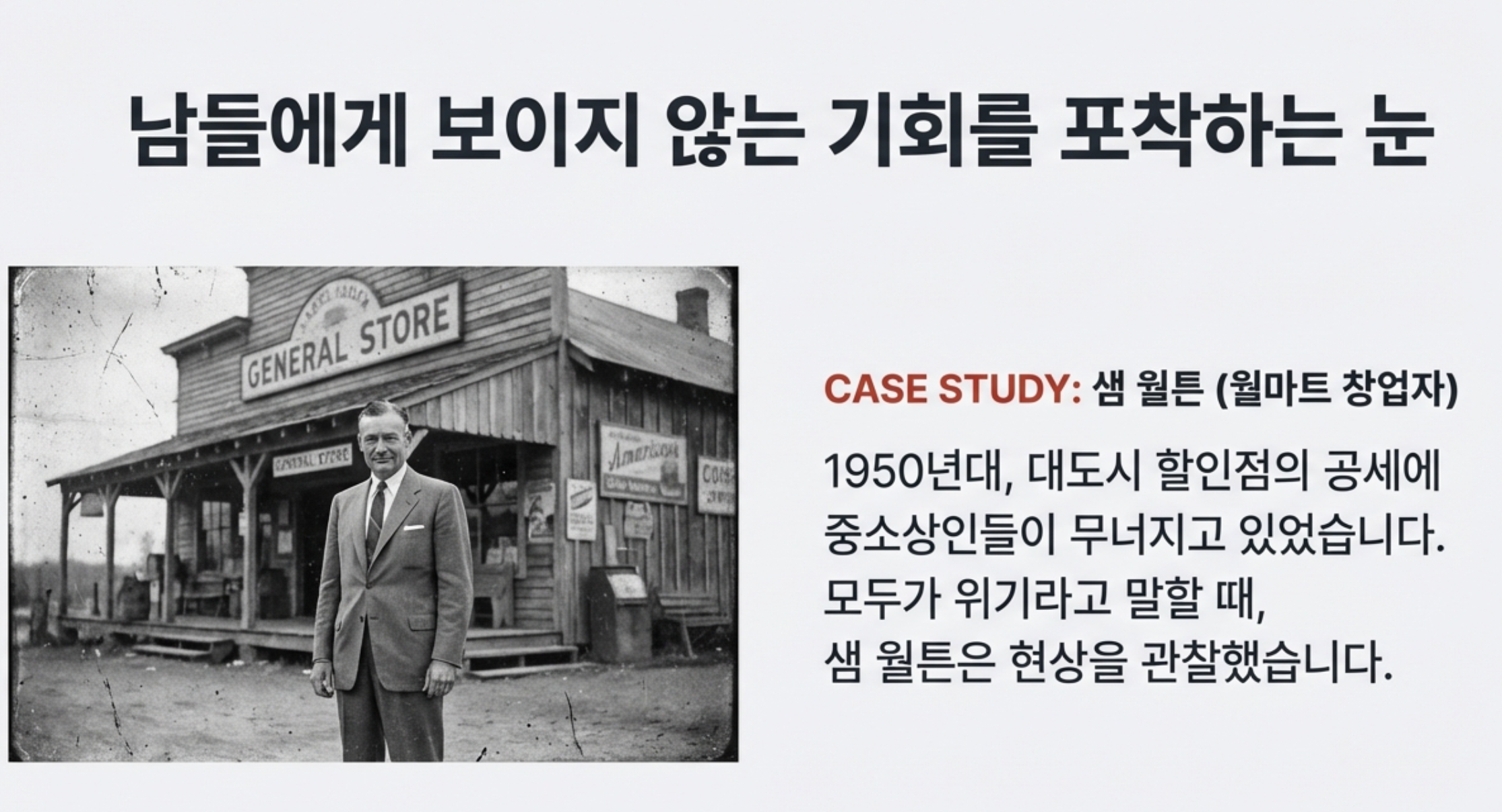 - 관찰: 샘 월튼은 대도시 할인점 주차장에 '시골 번호판 차량'이 늘어나는 것을 발견.