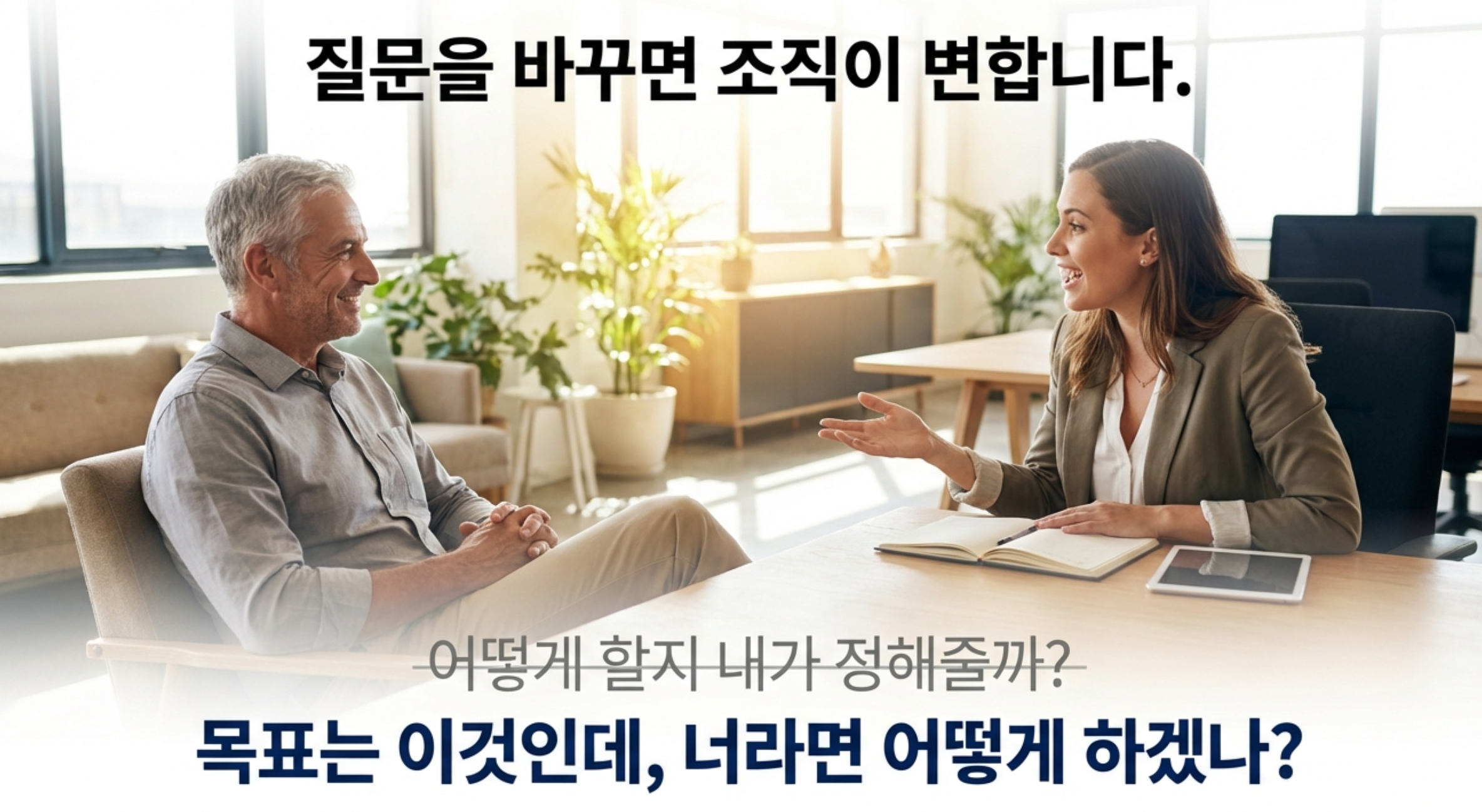 대신 "우리가 달성해야 할 목표는 이것이다"라고 명확히 선언하고, 그 방법론(How)은 팀원에게 물어보는 것부터 시작해 보세요.