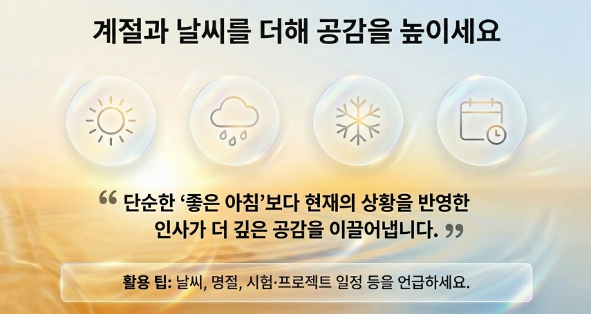 “오늘 비 온다는데 우산 챙기세요 ☔”처럼 실용적인 정보를 포함하면 더욱 유용한 인사가 됩니다.