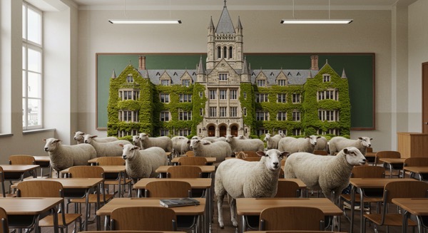 획일화된 교실 양떼 이미지와 명문대 건물을 합성한 이미지