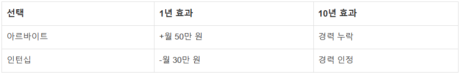 - 장기적 선택 vs 단기적 선택의 10년 후 비교