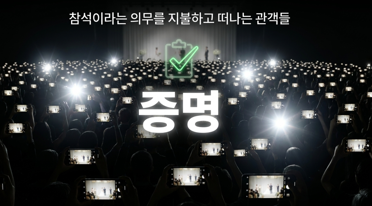 하객들 역시 진정한 축하와 교감을 나누기보다는, 그저 사진 촬영으로 방문을 증명하고 서둘러 뷔페로 향하는 형식적인 참여에 그치고 있습니다.