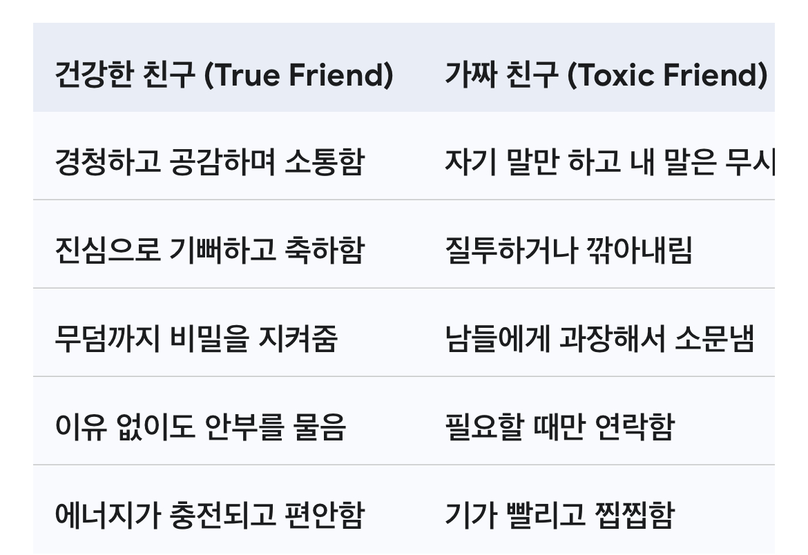 영상에서 강조하는, 내 인생을 좀 먹는 대표적인 가짜 친구 유형 5가지를 분석해 보았습니다.